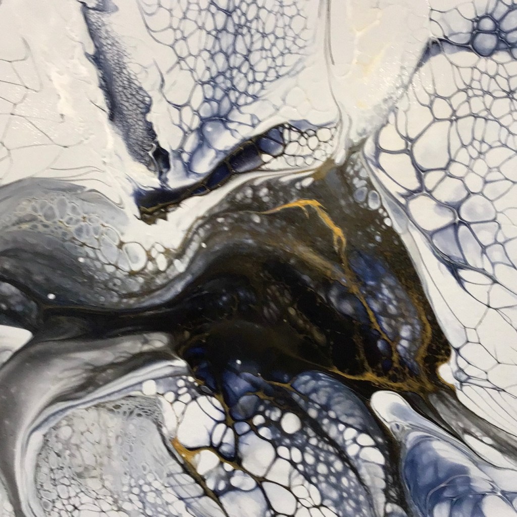 Cheril learned techniques to pour acrylics on canvas, and became intrigued by the science behind this form of art.